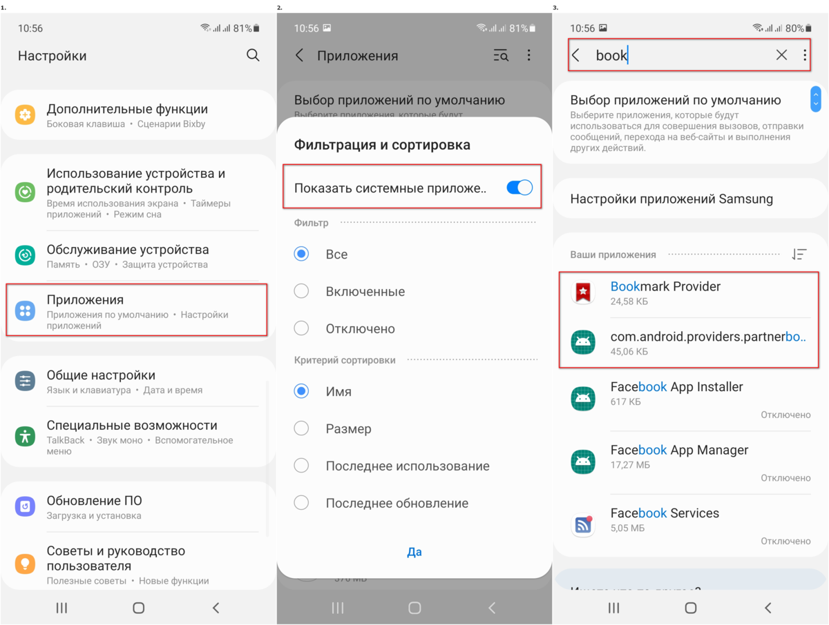Сейчас мы с вами найдем пару таких приложений. Заходим в список приложений, далее отмечаем галочкой "системные приложения" и вводим в поиске "book".