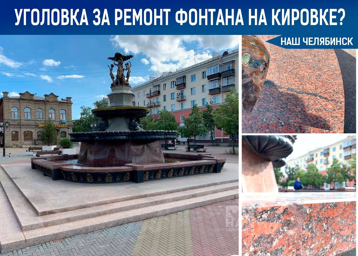 🚧 В Челябинске силовики вскрыли нарушения при контракте на ремонт фонтана «Танцующая грация» на пешеходной части улицы Кирова в Челябинске. При проверке вскрылось, что дорогие материалы подрядчик здесь заменил более дешевыми, а заказчик работы принял и оплатил. Сейчас решается вопрос о возбуждении уголовного дела. 29 июня 2020 года директор МАУ «Городской сад им. А.С.Пушкина» Игорь Клеин заключил с челябинским ООО «Техинвестстрой» договор подряда на выполнение работ по текущему ремонту фонтана на улице Кирова на сумму 2,8 млн рублей. Работы должны были выполнить до 30 августа 2020 года. 👉🏻 В рамках договора подрядчик должен был использовать гранит марки «Maple Red». Однако, выяснилось, что был применен гранит марки «Капустинский» и гранит Южно-Султаевского месторождения. Причем часть этого гранита ранее уже была установлена на этом фонтане в тех же местах, то есть гранит просто не меняли. Разница в стоимости составляет более 560 тыс. рублей. По материалам znak. com.