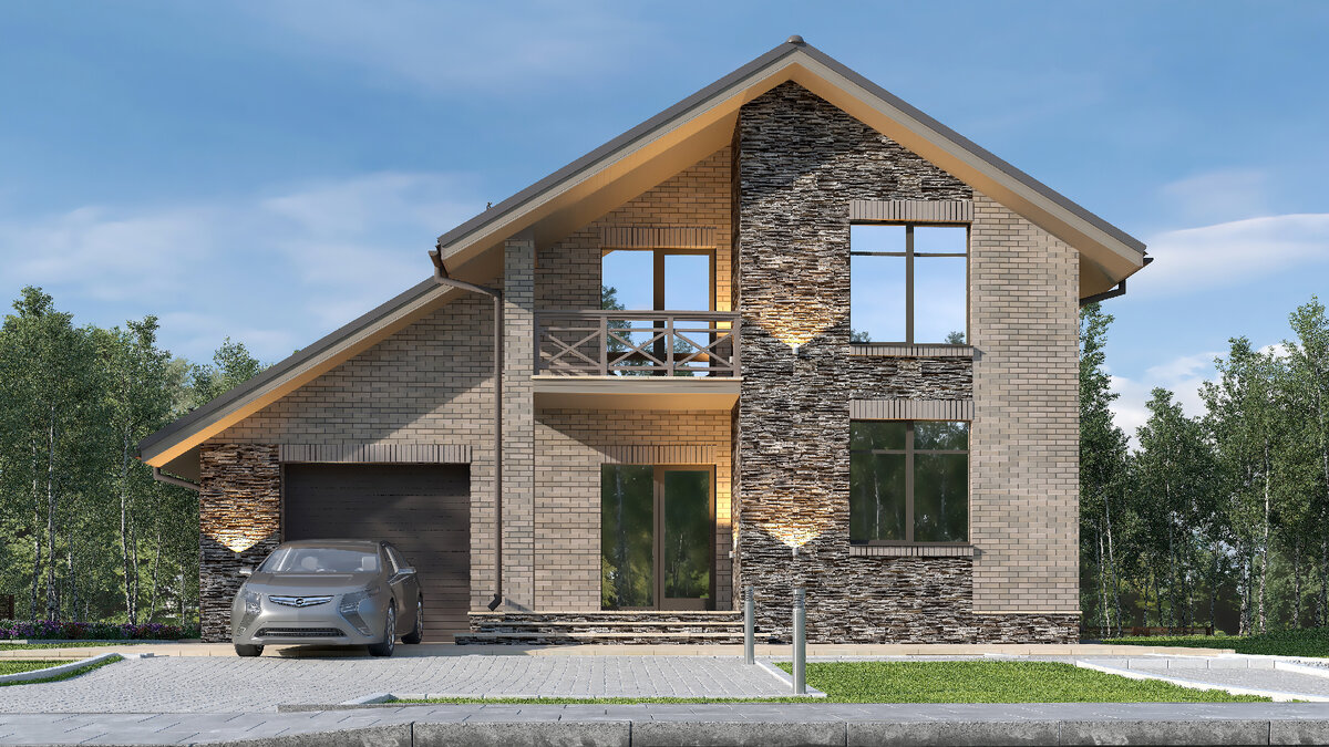 Дом как бы простой снаружи, но функциональный внутри и стильный внешне. В доме преобладают коричневые тона. Из гаража предусмотрен отдельный выход в дом - и это круто. Тамбур очень просторный. Гостевая комната - размеров как себе. Большая гардеробная в центре дома - куда без неё? Котельная с элементами уборной. Гостиная со столовой в глубине дома с выходом на террасу. На втором этаже 4 спальни с одним выходом на балкон, раздельными ванной и уборной и в прикуску кладовой. Цвет авто поставил в тон дому) На фасаде кроме облицовочного кирпича есть ещё отделка искусственным декоративным камнем. Подсветка на террасе придаст уют. Коричневые рамы - это дань моде. Текстура коричневого кирпича Браера в масштабе.