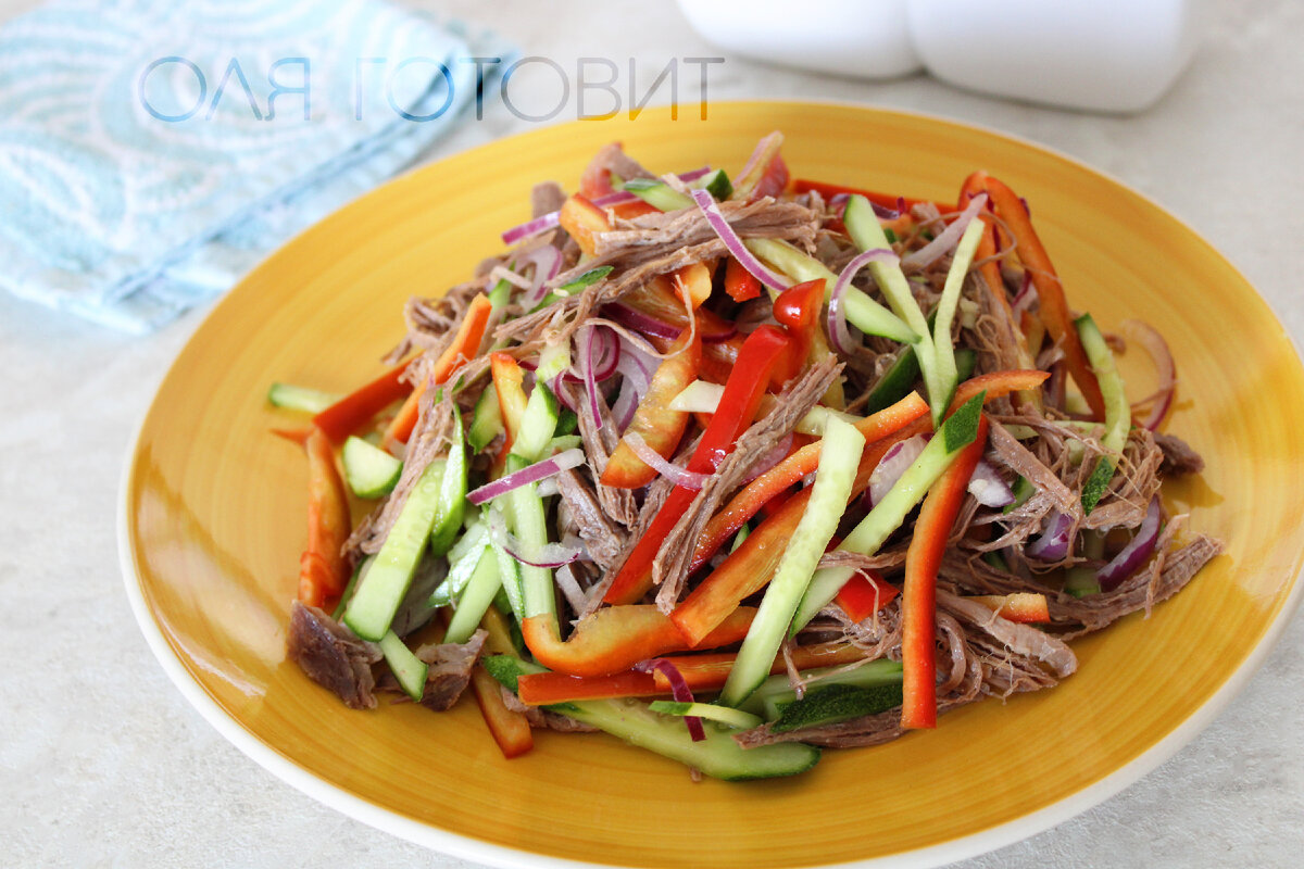 Мясо я рву на волокна, но можно нарезать как угодно. Два огурца режу соломкой.