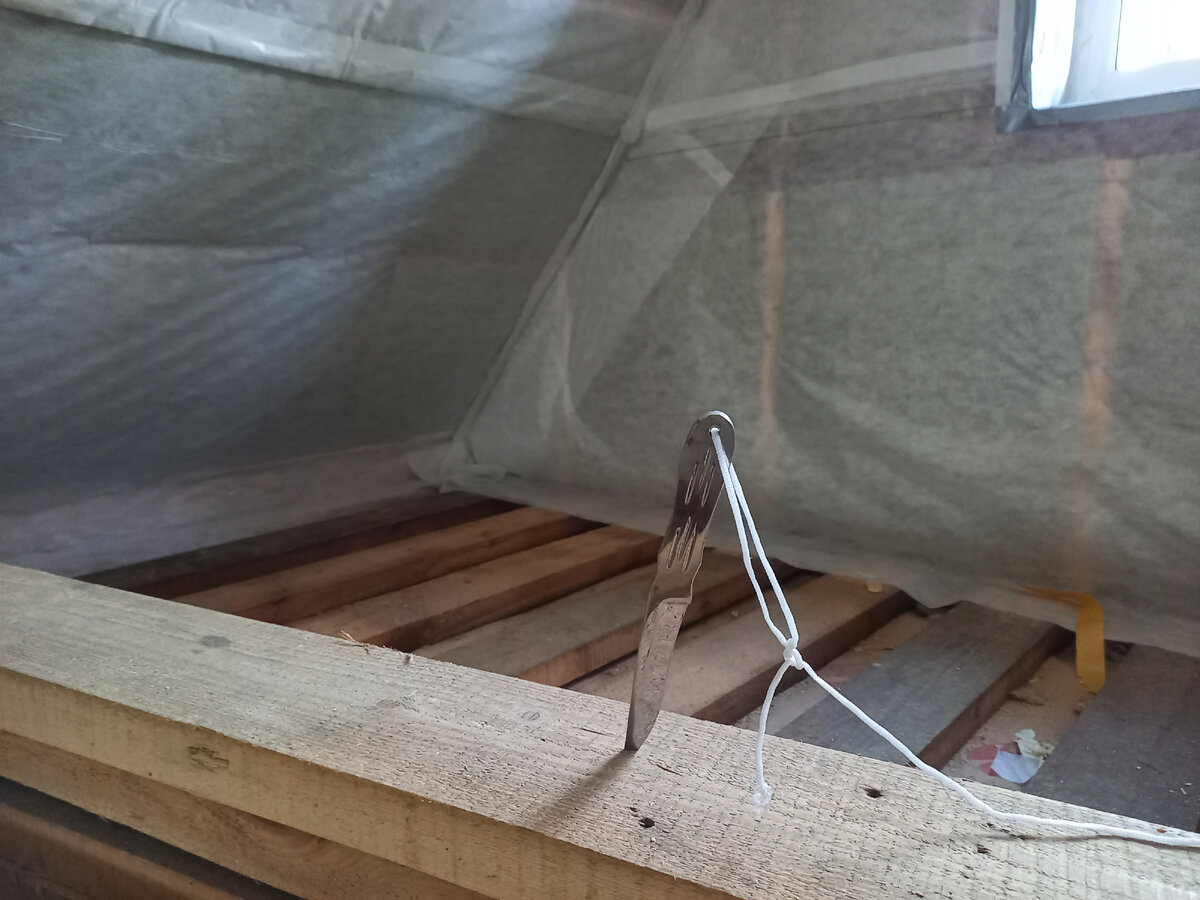 В апреле приступил к разделению мансарды на комнаты. Каркас перегородок делал из доски 50х100 мм. В наличии было достаточно доски 50х150, поэтому ручной циркуляркой с боковым упором и диском на 48 зубов для продольного пиления нарезал из нее требуемый размер - пилится на УРА. Предварительно сделал разметку лазерным нивелиром. Установку начал с нижних, а затем верхних "направляющих" брусьев. Установку верхнего бруса контролировал с помощью отвеса: Для установки верхнего бруса в одиночку использовал простое приспособление: И далее продолжаю возводить перегородки: В последующем перегородки были обшиты ОСП, внутри для шумоизоляции использована минвата. ОСП использована толщиной 8 мм, т. к. в дальнейшем вешать на стену ничего тяжелее фото в рамке не предполагается. Для чистовой отделки будет использоваться гипсокартон. Электропроводка проведена внутри стен целыми кусками.