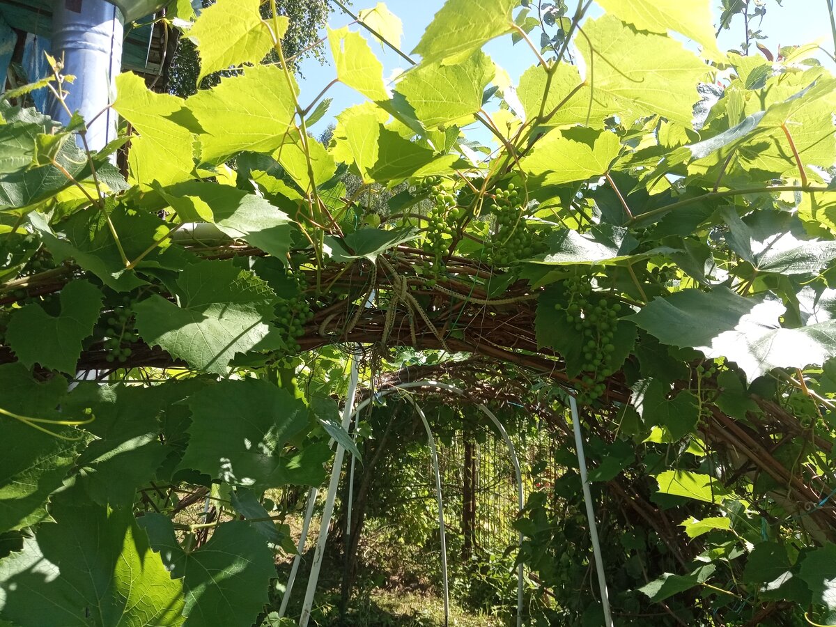 Мой виноград растёт в Подмосковье. Даже в таком регионе я его никогда не укрываю на зиму, не обрезаю. Посмотрите, как придумала подвязать плети. При минимальном уходе собираем виноград сорта «Изабелла» ведрами: делаем из него вино, сок, компоты, едим в свежем виде. Как я придумала подвязать виноград Виноград «Изабелла» обильно плодоносит каждый год. К концу сентября на нём висят множество спелых гроздей. Их нам хватает с лихвой. A прилетающие на зимовку снегири, а также местные синички лакомятся остатками ягод. Поэтому винограда всем хватает. Так как он сильно разросся, то нужно было его подвязывать. Я привыкла экономно вести хозяйство, поэтому вариант с покупными сварными металлическими арками не рассматривала. Решила сделать бесплатные опоры. Одну большую белую дугу мне отдала соседка. Когда я поставила эту опору, то по центру у арки получилась высота 180 см. Сначала привязывала виноград к ней. Но «Изабелла» быстро разрослась, поэтому встал вопрос о дополнительных перекрытиях. У меня