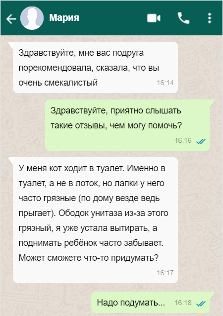 Всем хотелось бы иметь кота, который бы ходил в туалет (ещё бы они умели смывать...но слишком многого уже хотим от пушистиков), хотя некоторые трудности могут возникнуть и в столь идеальном варианте В этот момент я вспомнил сиамского кота моей бабушки (о его суперспособностях я рассказывал в статье о живности из детства маман) и даже задумался, не было ли у них проблемы с грязным ободком унитаза, а потом начал припоминать, что у бабушки был пунктик на чистоту полов, наверное, у кота лапки были всегда идеально чистые и розовые) После этого я ушёл на просторы интернета искать самоподнимающийся стульчак, чтобы уж не ехать в кафе с вопросом "подскажите производителя ваших сидений для унитаза". Нашёл я ребят довольно быстро, так как фирма вылетела в поиске одна (если кому будет интересно, в комментариях напишу фирму), в Москве даже самовывозом смог забрать. Приехал к клиентке и довольно быстро установил чудо современных технологий) Но через пару дней снова получил сообщение В этот раз ду
