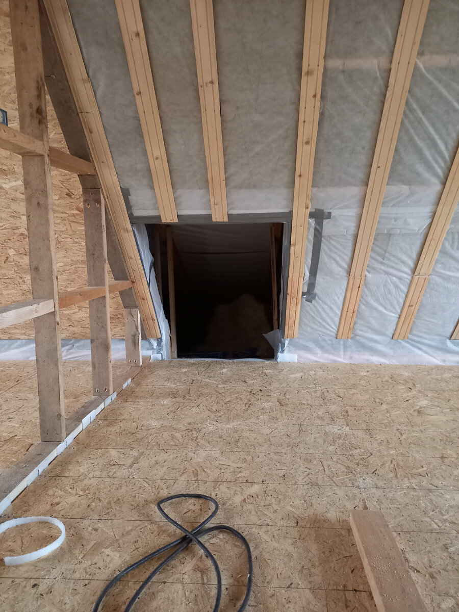 После установки каркаса перегородок и настилания ОСП 15 мм на пол изготовил дверь в холодную часть чердака, примыкающего к крыше мансарды. Выход будет из одной из комнат. Рама двери сделана из доски 25х100 мм, обшита остатками ОСП 15мм, внутри утеплена пенопластом. Дверь вставлена между стропилами крыши. Получился проход 1200х600 мм.