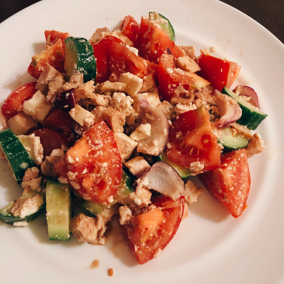 Куриное филе (приготовьте как любите, я сделала в пергаменте магги на сковороде без масла) нарежьте кубиком. К нему добавьте крупно порезанные овощи и сыр, добавьте лук, посолите, заправьте оливковым маслом, бальзамическим уксусом и всё хорошо перемешайте. Очень вкусный салат! Обязательно попробуйте и он станет вашим любимым.
