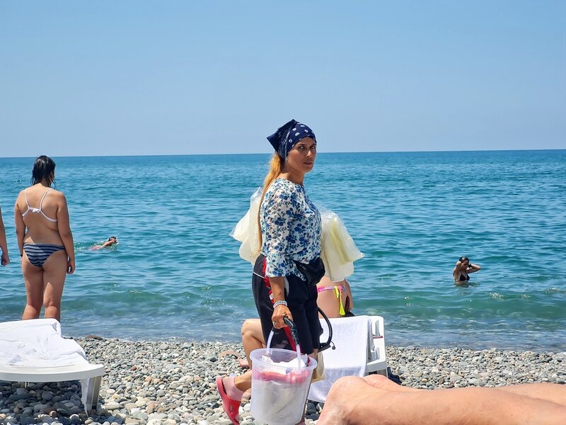 Симиндиии, бублики.... Кола, вода, фанта.... Городской пляж Батуми... С какой стороны тут Батуми? Да потому что на российских пляжах творится то же самое... Только торговцы кричат чаще без акцента... И так целый день. К вечеру после пляжа голова болит не от солнца. А от заунывных криков пляжных торговцев. Понимаю - не легко им... целый день бродить по пляжу под палящим солнцем, когда в тени градусник показывает +35. Но тут уж кто на что учился... А еще галька...... Терпеть не могу крупно -галечные пляжи, на которых без тапочек в воду не войти. С 1974 года. Когда была в Артеке. Путевкой туда меня премировали за выигранную республиканскую олимпиаду по математике. Довольно странный был отдых во всесоюзной здравнице для особо отличившихся. Одежду выдавали казенную. Свое даже нижнее белье не позволялось оставить. И конечно никаких пляжных тапочек. А купание по свистку вожатого. Свисток - все в воду. Свисток - быстро на берег. Я тогда даже побраться до воды по камням не успевала. Так каже