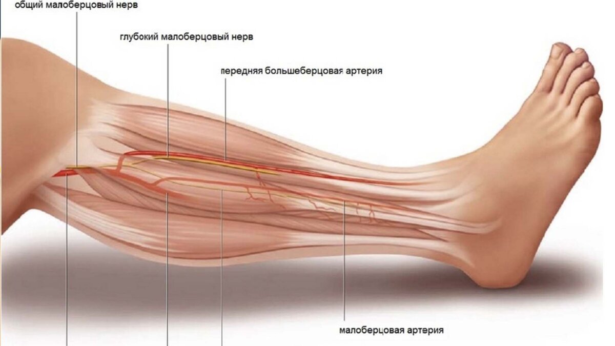 Общий малоберцовый нерв состоит из волокон четвертого и пятого поясничных и первого крестцового спинномозговых корешков. Он образуется вместе с большеберцовым в месте разделения седалищного нерва в подколенной области. Далее этот нерв идет по боковой поверхности колена, обходит головку малоберцовой кости и проникает в начало перонеальной (малоберцовой) мышцы. Здесь нерв начинает расходиться на ветви: внутренние и наружные глубокие, а также поверхностную. Сенсорные ответвления обеспечивают чувствительность кожного покрова задненаружной области стопы и голени. Двигательные ветви отвечают за работу перонеальной мышцы, стопных и пальцевых мышц-разгибателей, пронацию стопы (способность выворачиваться внутрь при движении).