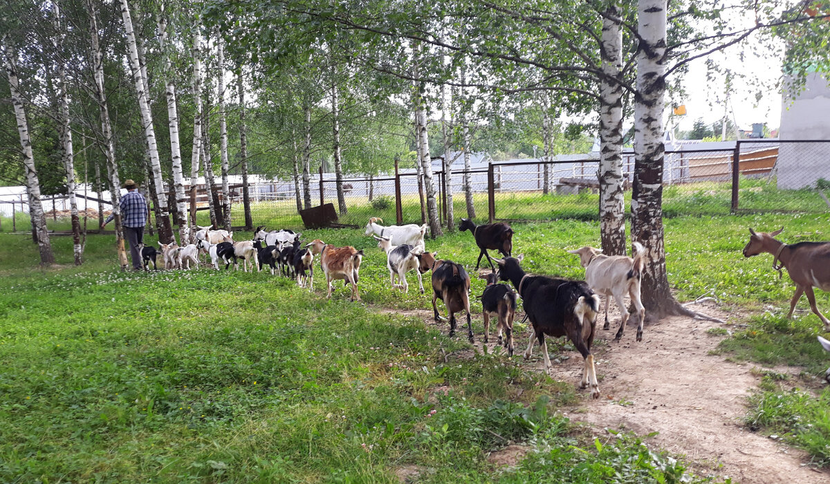Пастух гонит стадо домой, путь лежит через дорогу. По дороге идет мужчина с собакой на поводке. "Рядом!" - командует мужчина собаке. Послушный пес спокойно идет рядом, не обращая внимания на стадо коз. Стадо дружно перешло дорогу, а две совсем маленькие козочки остались на другой стороне. Возможно, испугались собаки, а может, просто из хулиганских побуждений не захотели идти за всеми следом. Пастух побежал загонять козочек, стадо остановилось и продолжило собирать травку. "Сидеть!" - скомандовал мужчина собаке, и пес сел у ног хозяина. Прохожий смотрел, как козовод бегает за козами, и пытается перегнать их через дорогу, а вредные козявки носятся, как угорелые и не слушаются пастуха. Собака так же внимательно наблюдала за козочками, в нетерпении постукивая хвостом, но не двигалась с места. Немало побегав и не раз споткнувшись, пастух чуть не упал в грязь, и прохожий рассмеялся. Наконец, мелкие хулиганки перескочили на другую сторону, за ними следом на дорогу вышел козовод и поравнялс