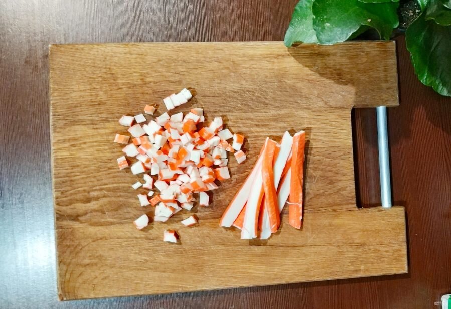 Этот невероятно классный рецепт посоветовала мне моя близка подруга , на какое-то время я про него забыла , но как наступила лето , то захотелось чего-то вкусненького . На первый взгляд этот рецепт может показаться обычным крабовым салатом , но вы не представляете как вкусно есть крабовый салат , но с капустой . Первым делом мы нарезаем наши крабовые палочки кубиком , но не слишком мелко. Предварительно подготовьте такие ингредиенты как : Крабовые палочки Салатный лист Яйца Капуста Майонез Далее шинкуем нашу молодую капусту . Не думаю , что слишком много нам понадобиться , поэтому берем чуть меньше половинки После того как мы нарезали капусту и крабовые палочки , мы насыпаем это в мисочку и открываем баночку кукурузы и так же ее высыпаем . Варенные яйца так же нарежьте кубиком вместе с желтком , лист салата можно просто порвать на не совсем мелкие куски и все это высыпать в миску Все это заправить майонезом И вот наш вкусный салат готов! Приятного аппетита!