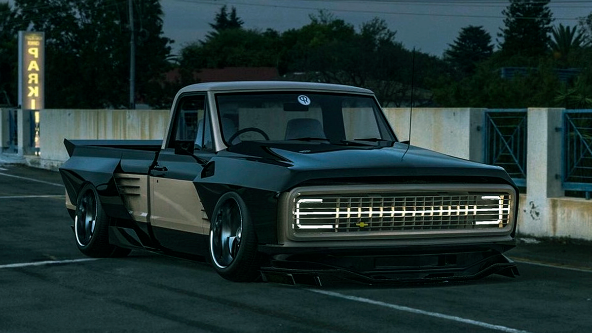У наших заграничных товарищей считается вполне достойно модернизировать грузовики Chevy C/К и рассекать на культовом пикапе с внешне измененным видом, на подобие наших любителей боевой классики. Особенно, если это более старая модель, такая как автомобиль первого или второго поколения. Как мне кажется, на наших улицах, этот малыш вызвал бы бурю внимания и восторга. Данный шедевр был создан и любезно предоставлен Ростиславом Прокопом. При более детально рассмотрении, профессионал заметит что в качестве чертежа использовался Chevy C10 второго поколения . Об этом можно судить по складке посередине капота и дизайну задней двери. Грузовики Chevy второго поколения серии C/K производились с 1967 по 1972 год, и вы могли получить их в полноразмерном исполнении, с шасси, с кабиной и в качестве коммерческих грузовиков средней грузоподъемности. Это легкая модель с цифровыми расширяющимися крыльями, передним спойлером, нестандартной решеткой, нестандартными колесами, заниженным дорожным просветом,