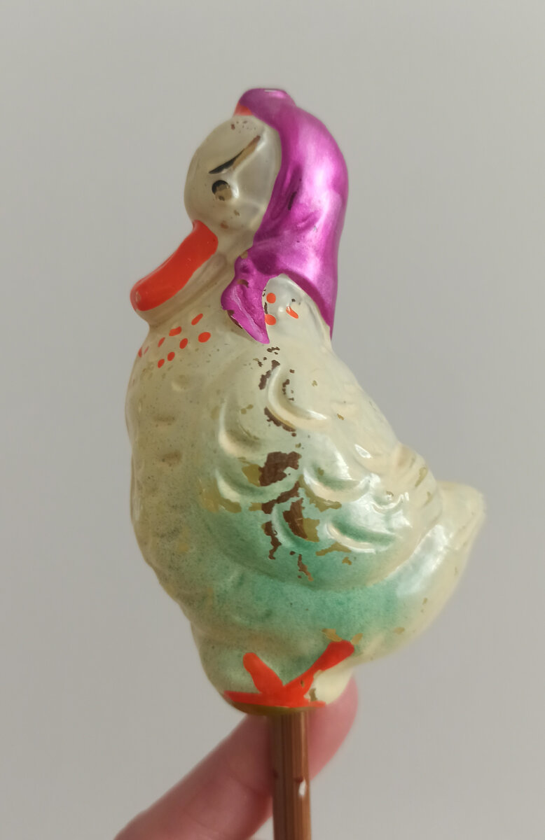 У меня часто так бывает, что какие-то игрушки попадают ко мне случайно. То есть я их не ищу, а они сами ко мне "приходят". Игрушку "утка в платке" или как ее ещё называют "мама-утка" я не искала специально. Честно говоря, она мне особо и не нравилась. Но я спасаю всякие игрушки, поэтому взялась и за неё. У игрушки был разбит низ и отбита трубочка. Кроме того по краске были потери. Всю краску с игрушки удалила. Низ и трубочку нарастила с помощью эпоксидки. Дальше самый красивый этап - покраска. Сначала жёлтый цвет, потом зелёным оттеснила крылья и низ. И глазки. Далее остались детали. Клюв, бусы и ноги сделала оранжевым цветом. Но не таким ярким, как в оригинале. Последний штрих - платочек. В оригинале платочек с металликом, но к сожалению, металлик пебео оказался полным разочарованием. Итог - вот такая мама-утка.