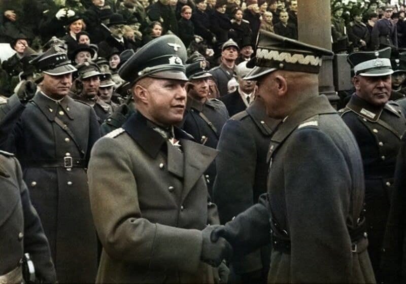Рукопожатие польского маршала Эдварда Рыдз-Смиглы и немецкого атташе генерал-майора Богислава фон Штудница на параде "Дня независимости" в Варшаве 11 ноября 1938 года.