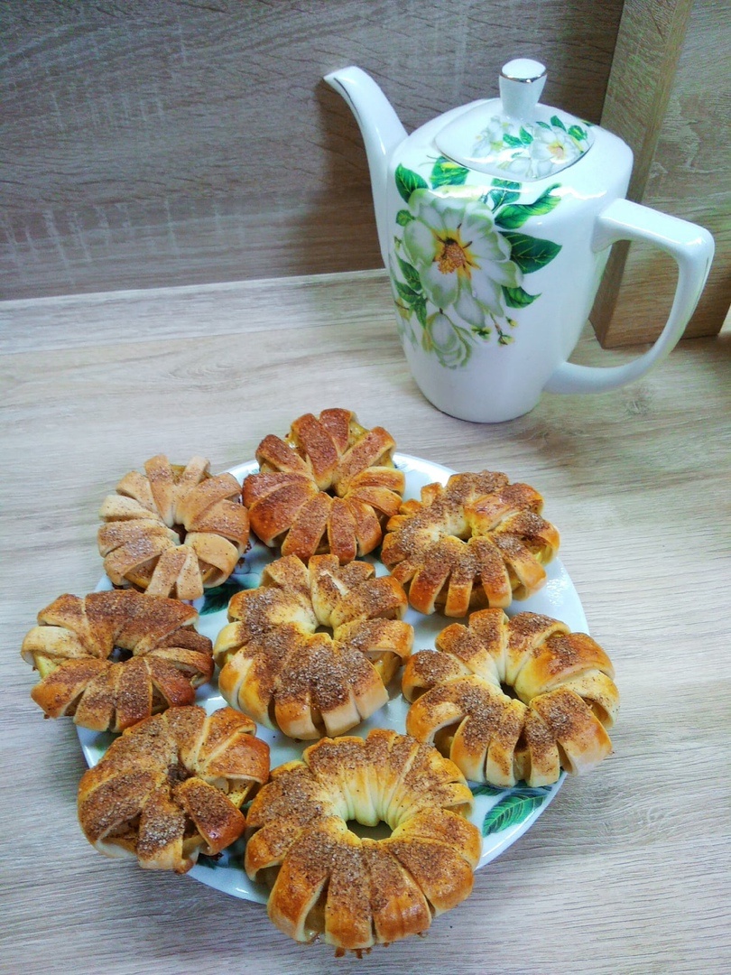 Для тех, кто не любит возиться с тестом, а вот поесть вкусняшек - с удовольствием! И так, записываем рецепт: 1) 0,5 кг готового слоеного (или дрожжевого теста) 2) 3 больших яблока 3) 1 яйцо 4) Мука (для раскатывания теста) 5) Корица, сахар, сахарная пудра (для посыпки) Яблоки - помыть, нарезать кружочками. Из каждого кружочка вырезать серединку, чтобы получилось колечко. Можно надавить крышкой от пластиковой бутылки - получится ровное отверстие! Тесто - разморозить, раскатать, нарезать полосками, шириной примерно 1-1,5см Яблоки замотать в полоски теста, продевая кончик полоски в яблочное кольцо. Яйцо взбить вилкой или венчиком, смазать полученные ромашки. Сверху хорошо посыпать смешанной с сахаром корицей. Запекать до румяной корочки при 180 градусах. Сверху можно присыпать сахарной пудрой, но мне вариант без пудры понравился больше!) Приятного чаепития :-)