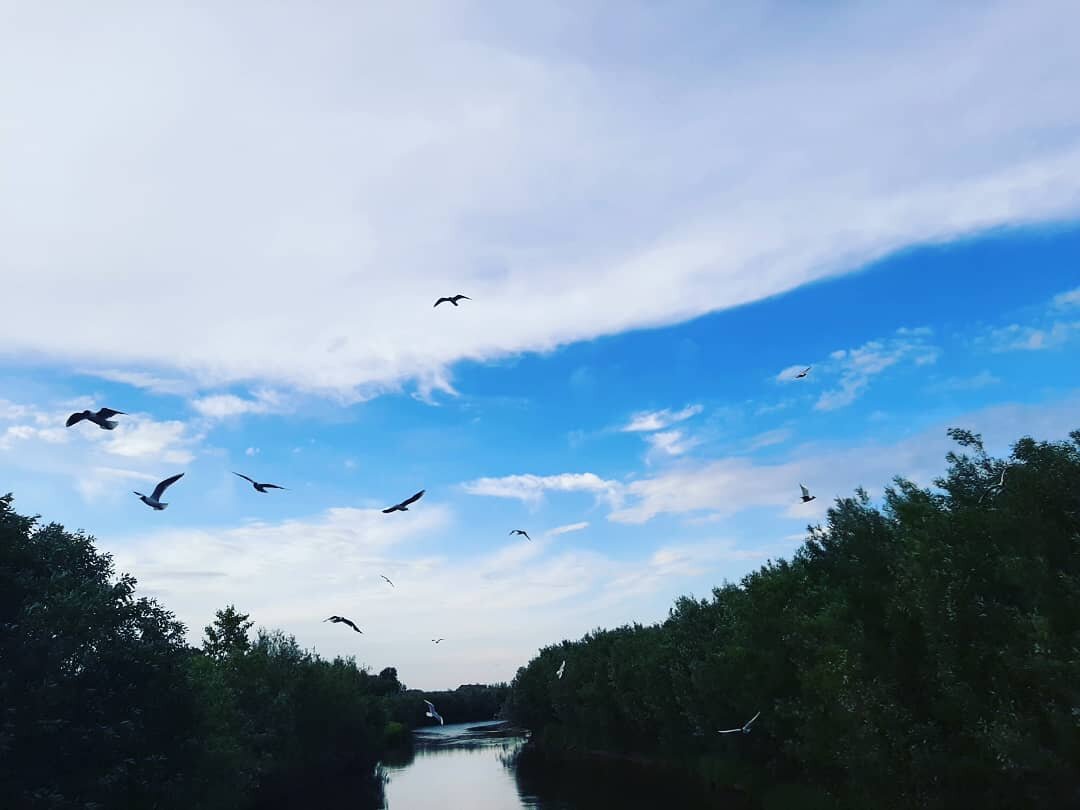 Ходили с сынишкой кормить уточек. Вроде все началось хорошо. Пришли на прекрасный верёвочный мост, но забыли купить прикормку. Собравшись с мыслями только начали собираться в магазин за хлебом и прилетели кучи чаек, начали кружиться над речкой. Это было настолько прекрасно, что решили просто пофоткать пейзажи и вот, что получилось...