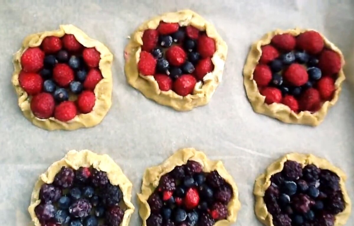 - Из каждой части раскатать кружочек и выложить на него ягоды, поднять края