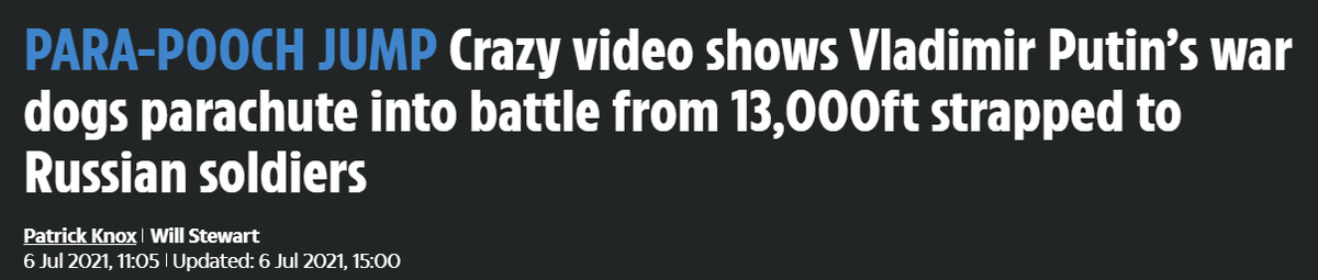 День сегодня был жаркий и утомительный, так что о серьезном не получается. Поэтому предлагаю поговорить об очень серьезном. И даже страшном. Начнем с Великобритании, где наисерьезнейшая газета, великолепная The Sun снова бьет тревогу. У сэров и пэров, вероятно, снова приключился спазм в горле и заляпанная овсянкой крахмальная салфеточка, аккуратно заправленная за крахмальный же воротник белоснежной сорочки. Когда вы узнаете причину, уверяю вас, вы возрадуетесь тому, что А) вы - не англосакс; Б) вы не читаете за завтраком английских таблоидов; В) вы не заправляете за воротник крахмальную салфеточку (а то стирать-крахмалить - гладить устанешь) Итак, новость номер РАЗ. ПАРА-СОБАЧИЙ ПРЫЖОК. Сумасшедшее видео показывает, как Путинские псы войны, привязанные к солдатам, прыгают с парашютом в бой с 13.000 футов. И само видео: Красивый заголовок, впечатляющий. Кот переводил. Далее фрагменты с переводом от Яндекса. Потому несколько неуклюже выглядит, уж простите. Появились СУМАСШЕДШИЕ кадры