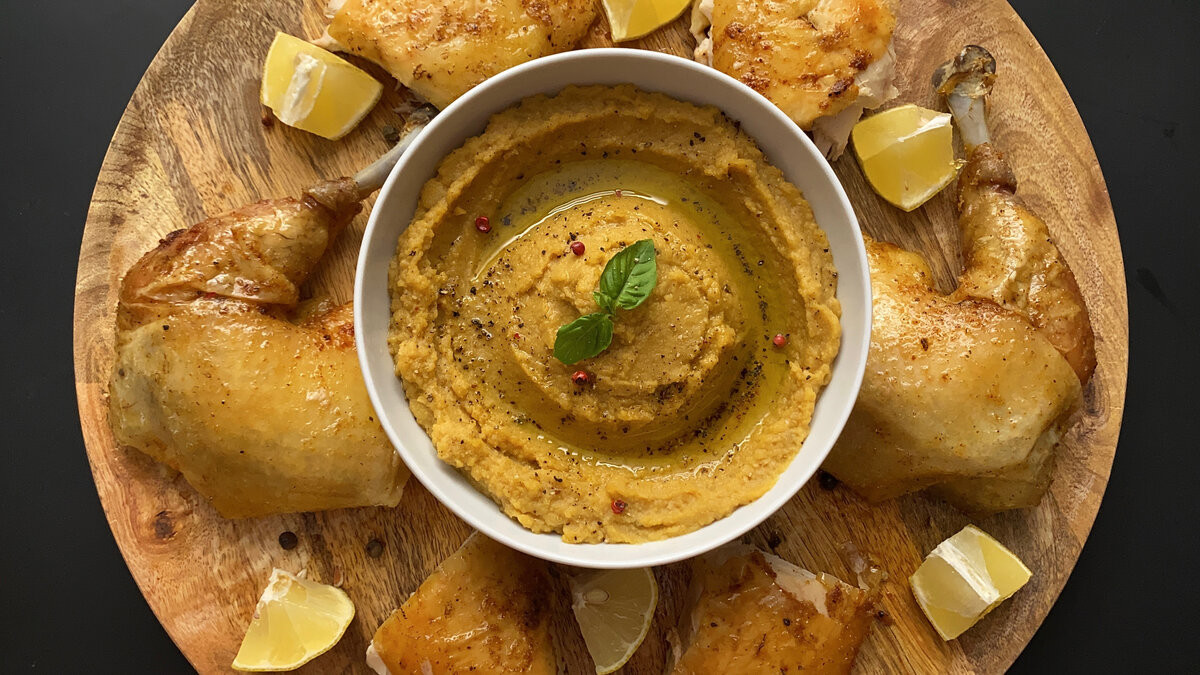 Всем привет! Рада видеть Вас на канале FOODVILLE. Меня зовут Галина и здесь я публикую только проверенные рецепты. Я тут на днях запекала супер сочную курочку, ну и пока он запекалась, решила приготовить пюре из нута с очень оригинальной заправкой. ИНГРЕДИЕНТЫ В КОНЦЕ. Отваренный нут солим и перчим. Оставляем немного водички, в которой он варился и измельчаем блендером. Натираем цедру одного лимона. Готовим заправку. В миску выжимаем сок половины лимона, добавляем горчицу и столовую ложку бальзамического соуса, ложку мёда и немного оливкового масла. Теперь соус нужно чуть-чуть взбить венчиком. Так все ингредиенты лучше объединятся и консистенция получится больше похожа на эмульсию. Вместе с курицей в духовку я положила пару зубчиков чеснока. Минут через 20 я его достала, почистила и протерла через сито прямо в соус. Можете, конечно, положить зубчик свежего, но запечённый имеет более деликатный и тонкий вкус. Всё, выливаем соус в нут, перемешиваем. Пробуйте и регулируйте на вкус, возмож