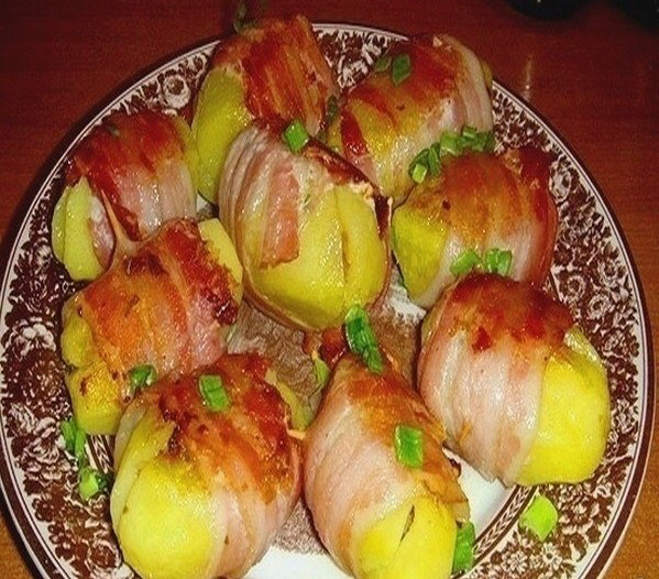 Ингредиенты: — 10 картофелин среднего размера — 15-20 тоненьких полосок бекона Для соуса нам потребуется: — 1 столовая ложка муки — ¼ л любого мясного бульона — 100-120 г жирной сметаны — 25-30 г сливочного масла — сок половинки 1-го лимона — соль, перец, специи по вашему вкусу Как приготовить: Картошку хорошо промываем. Отвариваем ее в «мундире», остужаем и потом чистим. На столе разложить по 2 полоски бекона, в которые потом завернуть картошку. Выкладываем нашу «одетую» картошечку форму или противень и отправляем на 10-15 минут в прогретую до 180-200о духовку. Пока печется наша картошечка, делаем для нее соус. Для этого в небольшой посудине растапливаем масло, осторожно всыпаем в него муку так, чтобы не образовались комочки. В эту смесь вливаем бульон, держим на огне до полного закипания и снимаем. Теперь в эту массу добавим сметаны, лимонного сока, солим и перчим. Нашу готовую картошку обильно поливаем сверху этим вкусным соусом и отправляем в духовку еще минут на 10-15, и да