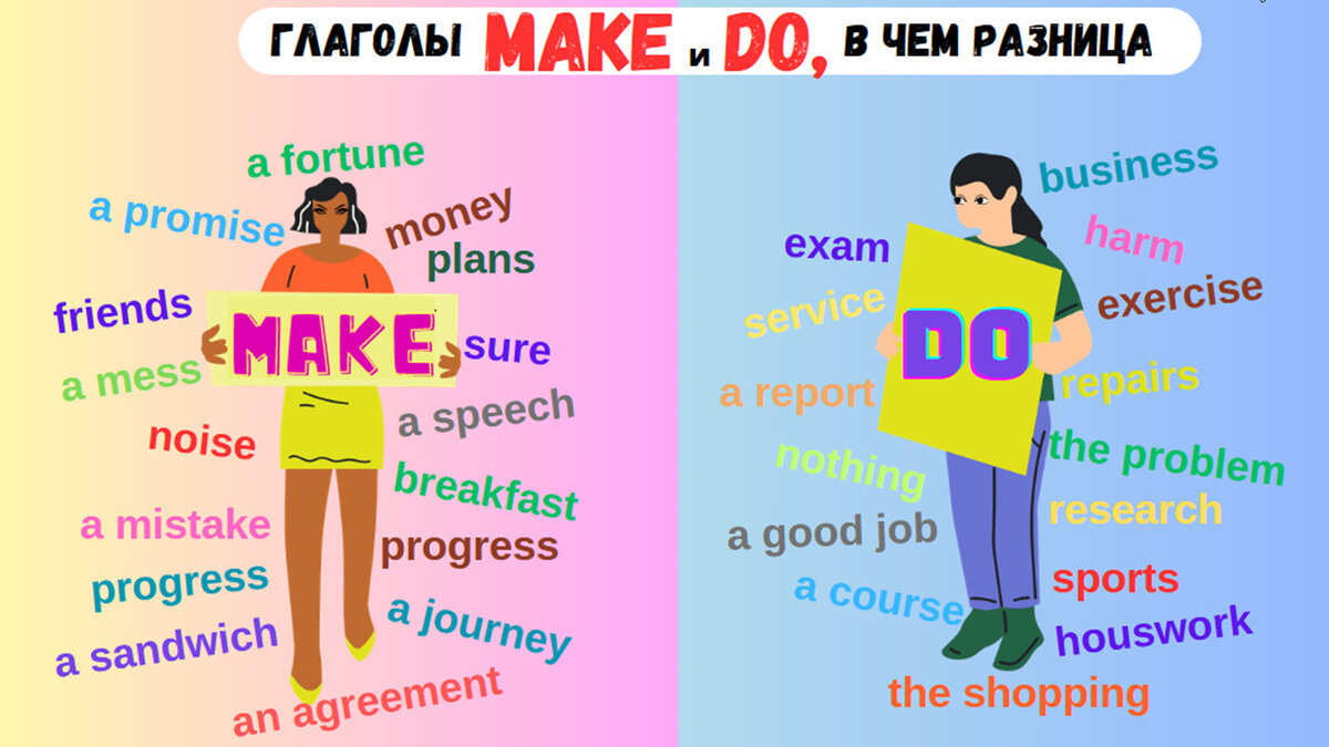 Нет никакого разумного объяснения, почему в одних случаях используется make, а в других do, хотя они оба имеют одинаковое значение «делать». Так исторически сложилось. Но, тем не менее, эти глаголы можно условно подразделить на группы в зависимости от деятельности, с которой каждый из них связан. И поэтому нам остается только запомнить эти группы и заучить эти глаголы, как устойчивые словосочетания из своей группы.