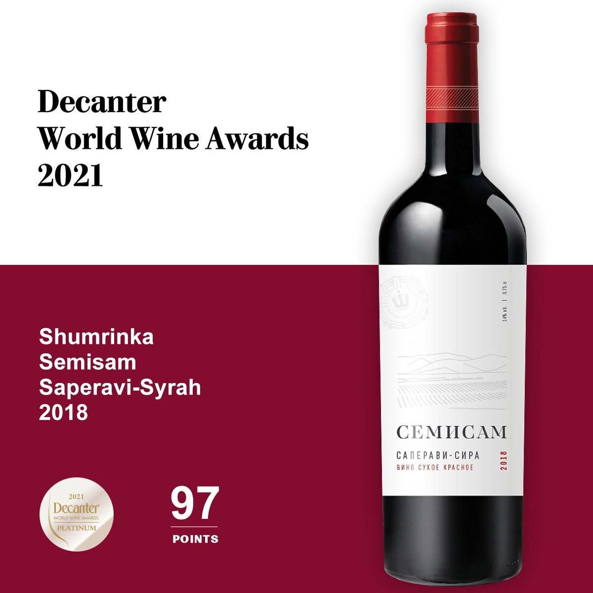 В рамках престижного международного конкурса Decanter World Wine Awards 2021, Великобритания, вино Шумринка Семисам Саперави - Сира 2018 года заслужило Платиновую медаль и самую высокую оценку среди российских вин за всю историю конкурса в 97 из 100 баллов. Поздравляем!