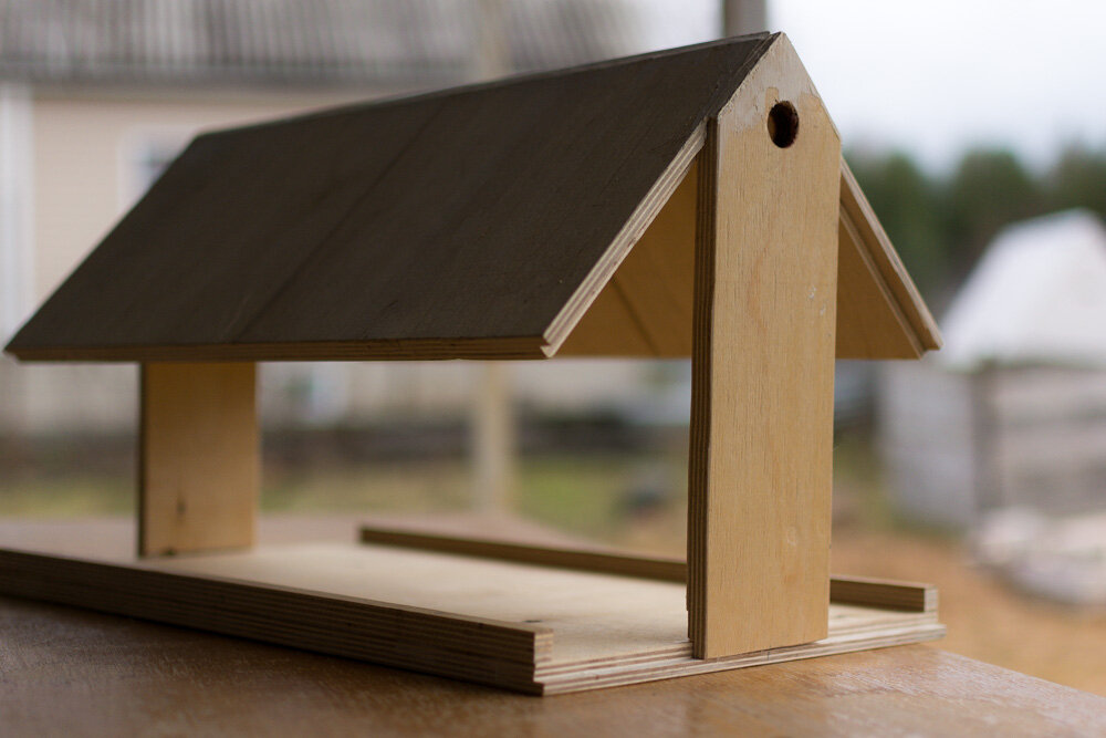 Кормушка для птиц из фанеры не лучший вариант, так как материал боится сырости, расслаивается. Однако 1-2 сезона конструкция прослужит, если ее сделать с влагоотталкивающей крышей. Немного срок службы фанерного изделия продлит окрашивание.