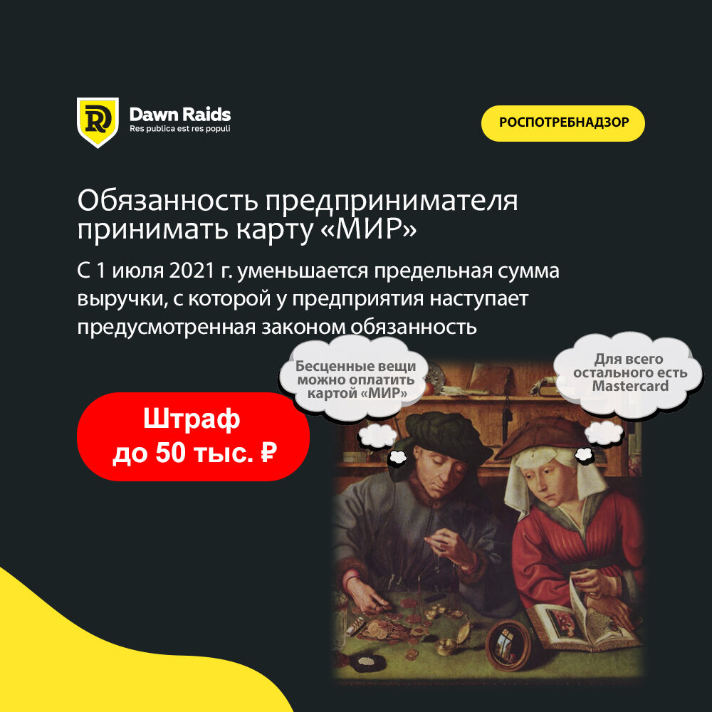 Наша сегодняшняя тема посвящена одному из элементов деглобализации: организации на территории России национальной платёжной системы карт (НПСК) и её детищу НПС «Мир», эмиссия которой началась 15 декабря 2015 г. 🔻 О чём речь? ✅ Федеральным законом от 5 мая 2014 г. в Закон РФ от 7 февраля 1992 г. № 2300-1 «О защите прав потребителей» введена статья 16.1, которой предпринимателей обязали обеспечить возможность оплаты товаров (работ, услуг) путём использования национальных платёжных инструментов. ️С 1 марта 2021 г. предоставить возможность потребителям расплачиваться НПС «МИР» обязаны предприниматели, чья выручка от продажи товаров (работ и услуг) за предыдущий календарный год превышает 30 млн ₽. С 1 июля 2021 г. сумма предельной выручки уменьшена до 20 млн. ₽. 🔻Кто может не исполнять данную обязанность? 🔻Ответственность Статья — ч. 4 ст. 14.8 КоАП РФ Кто возбуждает и рассматривает — РПН Наказание для ИП и ЮЛ — от 30 до 50 тыс. ₽ Срок давности — 1 год NB. Если дело возбуждено на осно