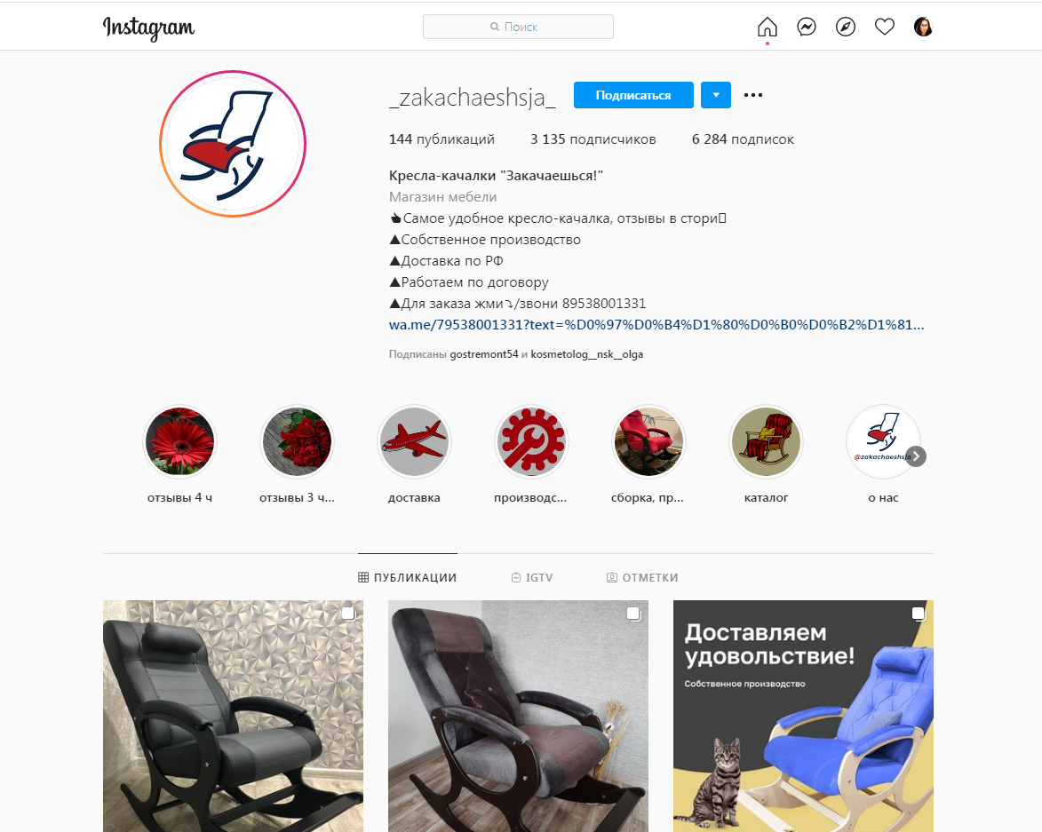 О клиенте. Производят только кресла-качалки на заказ. Территориально Новосибирск, доставку делают по всей России. В основном работают в среднем ценовом сегменте, цена кресел от 10600р до 14000р. Цель – привлечение клиентов через Инстаграм. Клиенты не особо верили в таргет, так как был негативный опыт с предыдущим таргетологом. Аккаунт достаточно привлекательный, с качественными фото и текстами. В закрепленных сторис есть раздел с отзывами, который регулярно пополнятся. Как работали : Проанализировали предыдущую рекламную кампанию Выявили ряд ошибок, которые проанализировала и исправили. Были изучены конкуренты Проанализированы боли клиентов Даны рекомендации по ведению профиля Составлена стратегия продвижения, на основе полученных данных и заполненного клиентом брифа Подготовили несколько вариантов аудиторий Разработали креативы и тексты. Клиентом было предложено 2 варианта оффера, скидка на доставку и акционная цена на самую популярную ткань обивки. Их в рекламе и использовали. Тести