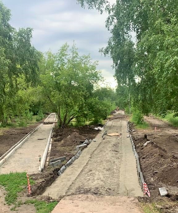 В июне подрядной организацией были выполнены демонтаж старого асфальтового покрытия, уборка поросли и вырубка части старых деревьев, снос которых согласован с жильцами близлежащих домов. Были подготовлены котлованы под новые пешеходные и велодорожки. По решению горожан для их укладки будет использоваться как асфальтовое, так и плиточное покрытие. Скорректированная траектория пешеходных и велодорожек позволит максимально сохранить деревья и зеленые насаждения. Кром того, в рамках проекта предусмотрена высадка новых саженцев рябины, сосны, березы, лиственницы, яблонь, ели, черемухи и т.д.
