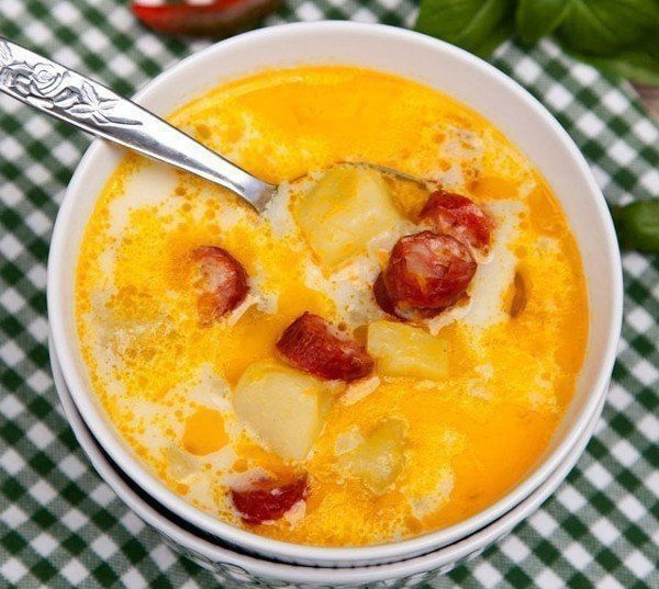 Всем привет!!! Наверняка вы сейчас думаете,что же приготовить на обед, и я решила вам в этом помочь. Делюсь с вами самым вкусным рецептом супа с копчеными колбасками, который получится у всех!!! Ингредиенты: Колбаса (копченые колбаски) - 3 шт; Картофель - 700 г; Репчатый лук - 1 шт; Морковь - 1 шт; Сметана - 150 мл; Растительное масло - 3 ст.л; Лавровый лист - 1 шт; Перец (черный) - 1/2 ч.л; Соль - по вкусу. Приготовление: Копченые колбаски очищаем и нарезаем кружочками, очищенный картофель - кубиками, лук - мелко, морковь мелко натираем. Выкладываем подготовленные кружочки в глубокий сотейник, и обжариваем до коричневой корочки. В жир после колбасок выкладываем лук жарим 2-3 минуты, добавляем подготовленную натертую морковь, жарим 3 минуты и добавляем кубики картофеля, перец. Вливаем в сотейник к овощам 1-1,2 литра воды (овощного бульона) и варим на слабом огне 12-14 минут. Выкладываем в суп жаренные колбаски, лавровый лист, варим супчик 5-6 минут и добавляем сметану, соль. Варим ар