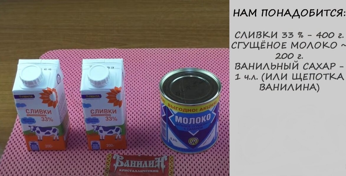 Привет, сегодня буду готовить вкусное домашнее мороженое. Для приготовления мороженого нам понадобится: 1)охлажденные сливки 33% жирности, чем жирнее сливки, тем вкуснее будет наше мороженое. 2) 1/2 банки сгущённого молока. 3) немного ванилина для аромата и соответственно то, чем мы будем сбивать наши сливки. Добавляем в сливки щепотку ванилина или чайную ложку ванильного сахара, сливки должны быть охлажденными. Минимум 5 часов должны постоять в холодильнике. Начинаем взбивать сливки на самой маленькой скорости, до мягких пиков масса в процессе взбивания должна увеличится в два раза, затем постепенно увеличивая скорость взбиваем до устойчивых пиков (это когда сливки остаются на венчике и никуда не опадают), но сбивать нужно очень аккуратно если перевзбить сливки то они превратятся в сливочное масло. Время взбивания зависит от объема сливок,скорости их взбивания, а также от марки производителя,в среднем около 2-3 минут. Когда сливки уже взбитые плавно начинаем уменьшать скорость вз