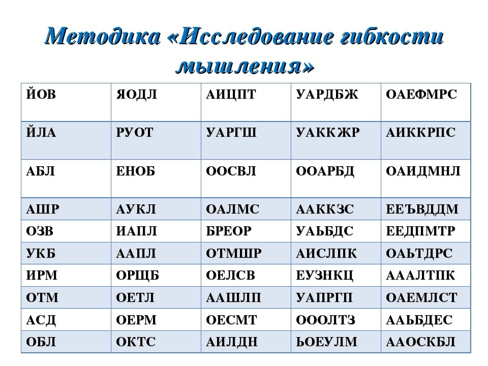 Методика позволяет определить вариативность подходов, гипотез, исходных данных, точек зрения, операций, вовлекаемых в процесс мыслительной деятельности. Может применяться как индивидуально, так и в группе. Ход выполнения задания Учащимся предъявляют бланк с записанными анаграммами (наборами букв). В течение 3 минут они должны составлять из наборов букв слова, не пропуская и не добавляя ни одной буквы. Слова могут быть только существительными. Обработка результатов Подсчитать количество верно составленных слов в течение 3 мин. Количество составленных слов — показатель гибкости мышления Консультация психолога через скайп