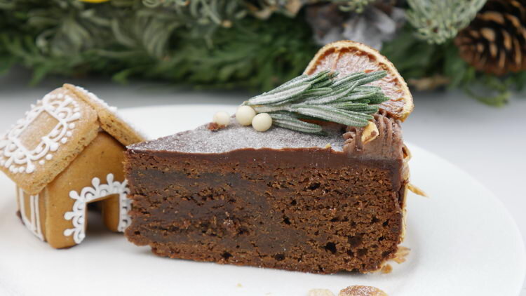 - А я позволила себе некоторые вольности и отступления от классики, украсив торт сушеными дольками апельсинов (как их сделать — смотрите здесь), а также веточками розмарина и маленьким пряничным домиком.