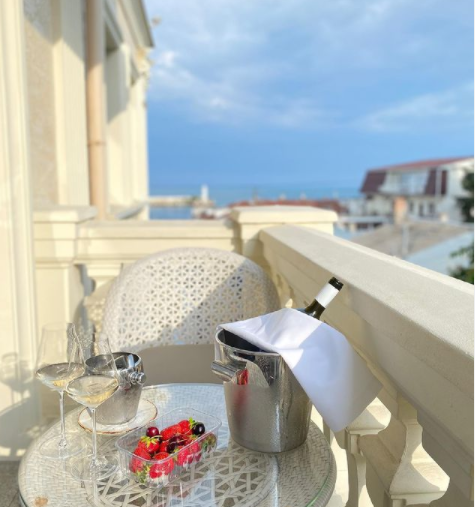 Мы купили черешню и клубнику, зашли в наш номер, я накрыла нам на балконе. Мы сели и замерли.