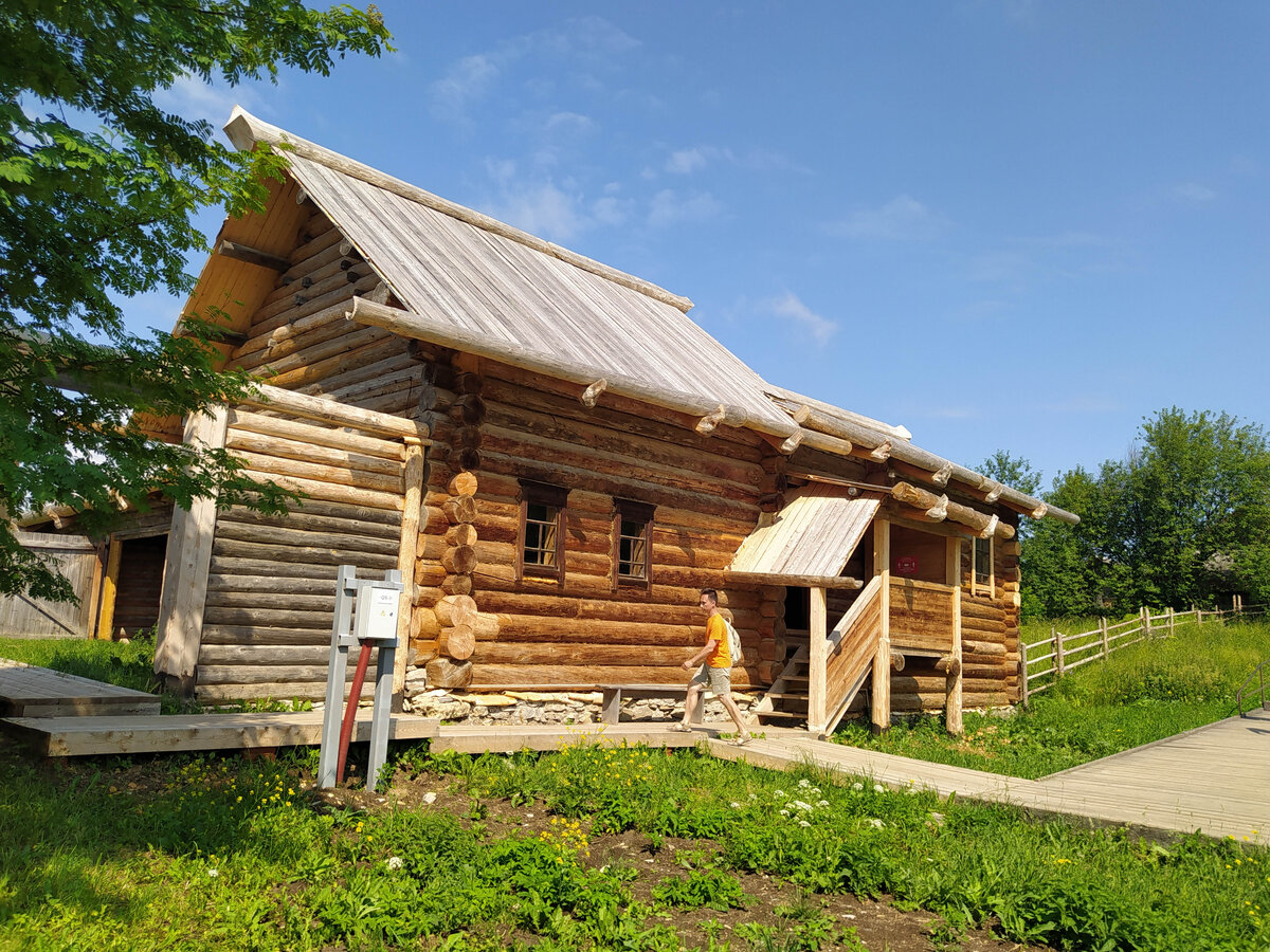 В Архитектурно-этнографическом музее "Хохловка" собраны деревянные постройки Прикамья. В музей привезены строения и комплексы сооружений со всего Пермского края. Здесь можно увидеть деревянные храмы и единственную сохранившуюся деревянную колокольню, хозяйственные и производственные постройки, солепромышленный комплекс и многое другое. В этой статье расскажу про усадьбы, представленные в музее. У самого начала маршрута размещена изба и хозяйственные постройки Северо-Западного Прикамья. Изба крестьянина П. И. Кудымова привезена из деревни Яшкино Юсьвинского района Коми-Пермяцкого автономного округа. В музей Привезена только сама изба, а вот все представленные хозяйственные и дворовые постройки воссозданы в музее по аналогии того времени. Это типичное хозяйство крестьянина XIX века. Здесь жилой дом из сосновых брёвен с двускатной крышей, амбар, ледник, баня по-черному, крытый двор с хлевом для животных. Дом и двор фактически под одной крышей. Внутри жилища очаг - дом тоже топился по-черн