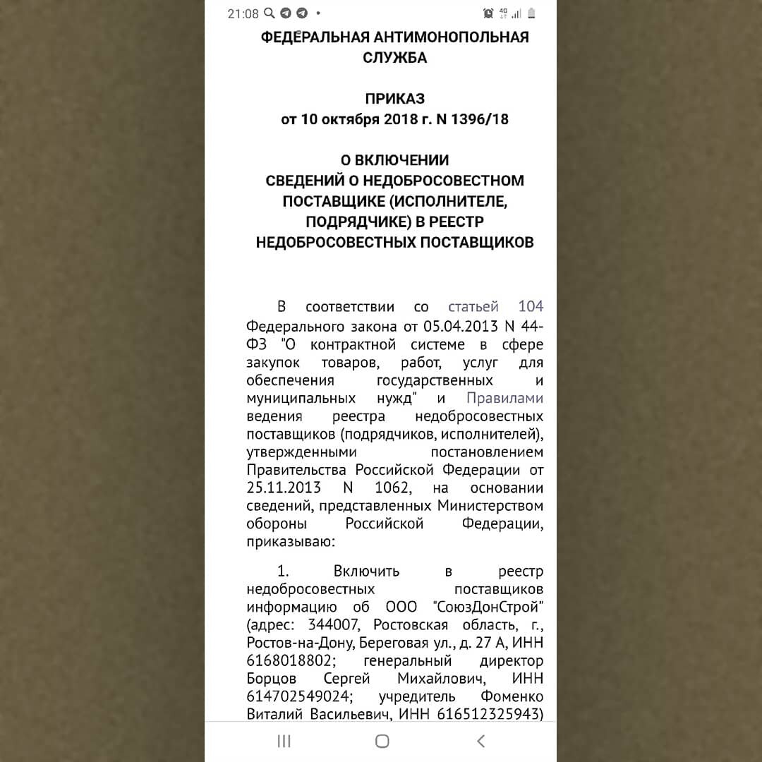 Вместе с коллегами Романом Яковлевым и Яковом Новоселовым изучаем вопрос строительства четвертого моста, развязки и дождевого коллектора на пл. Труда. Как следует из паспорта объекта, генподрядчик – ООО «ПФ «ВИС», подрядчик – АО «Индивидуальные Бизнес Решения», субподрядчик – ООО «СоюзДонСтрой». Решили навести справки, что это за организация ООО «СоюзДонСтрой». Выяснилось, что 10.10.2018 руководитель Федеральной Антимонопольной Службы России Игорь Артемьев издал приказ № 1396/18 о включении информации об этой компании в реестр недобросовестных поставщиков. Изучаем внимательнее. 1 июня 2017 года по делу № А40-44982/2017 Арбитражный суд города Москвы по иску Министерства обороны Российской Федерации принял решение о расторжении госконтракта по капремонту жилого дома СМР-10/225/177 от 09.10.2010 года (цена контракта 1 290 960 рублей, срок выполнения работ до 25.12.2010). Еще два факта для более полной картины. В конце 2019 года приказом ФАС России № 1596/19 от 04.12.2019 г. «в связи