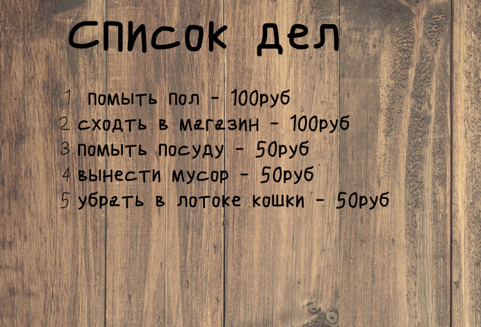 Позвонила мне расстроенная подруга и рассказала, что ее дочь подросток утром выдала ей список "мои услуги" с расценками. Подруга сказала, что составит свой список, что дочь офигеет! При этом подруга всегда по возможности даёт карманные деньги, на погулять отдельно дают. Ее дочь, в общем-то, не знает ни в чём нужды. И тут я задумалась: А вообще-то обидно, что ребенок может быть только потребителем, и на своих родителей смотрит как на кошелек. Чтобы дети были готовы помогать по дому, их следует с первых лет жизни привлекать к помощи - с уборкой, выносом мусора или покупками. Однако оказывается, что некоторые родители используют совершенно другой метод обучения. Они просто платят своим детям за домашние обязанности! С такой постановкой вопроса я в корне не согласна. И задаюсь вопросом: это ли подходящий метод воспитания? Может ли такой метод заменить карманные деньги и будет ли это эффективно? Ниже я перечислю 4 момента, чем может обернуться плата ребенку за домашнюю работу. Плата за выно