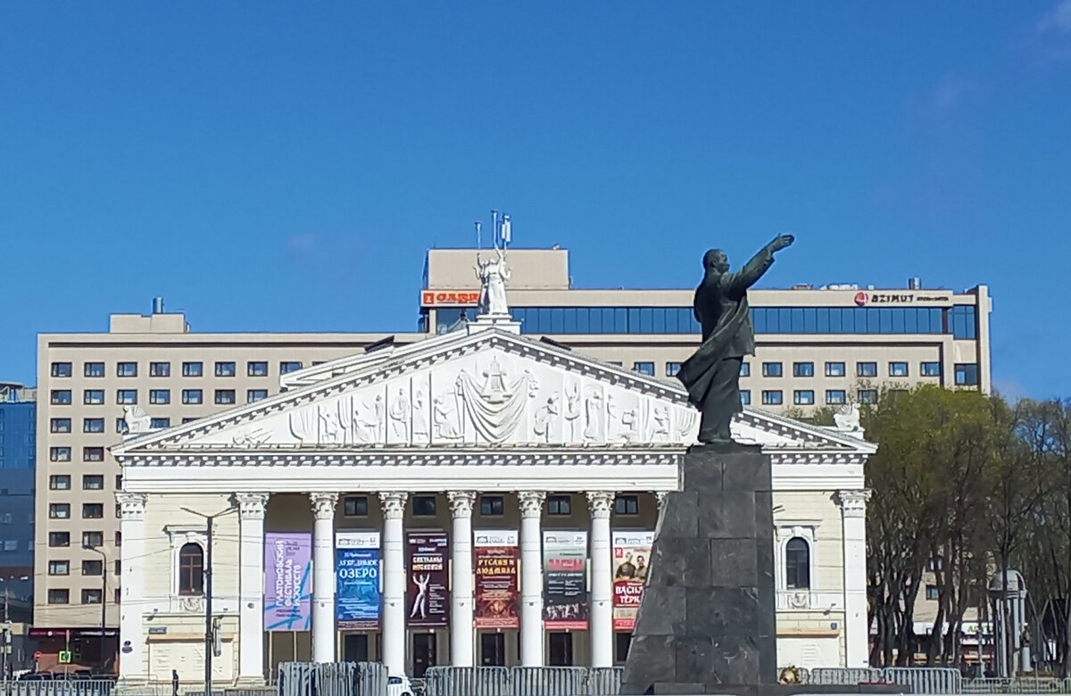 1. На центральной площади с поднятой рукой, указывающей направление, вижу дедушку Ленина перед театром. За театром сетевая гостиница "Азимут". Если в городе есть эта сеть, то я стараюсь номер бронировать у них. Правда, здесь не повезло: отключили горячую воду, номер был не готов, хотя заселялись уже вечером. Даже пришлось писать им нелестный отзыв. Обидели они меня.