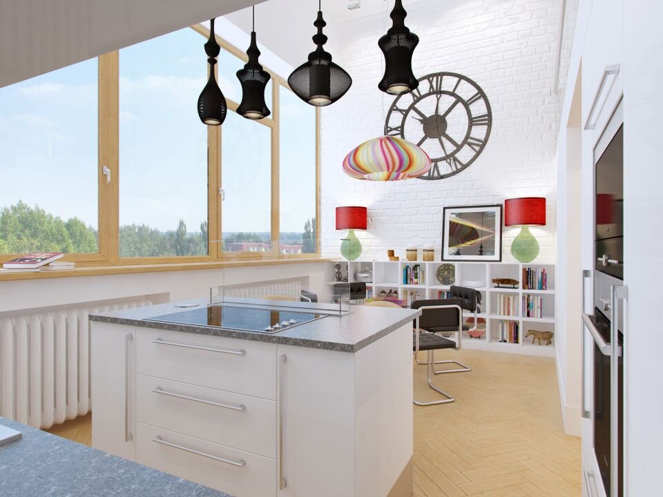 Главное отличие подвесных светильников в стиле лофт, от люстр в том что их задача создавать более локальное освещение в выбранной зоне. В углу, над барной стойкой, над кухонным островом, над столиком с фруктами или бильярдным столом, но основная задача все таки локальное освещение в определенной зоне. Вот к примеру:
