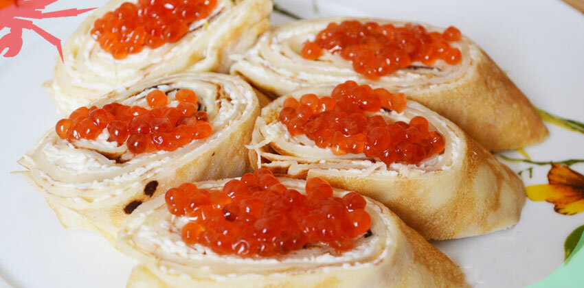 Ингредиенты: Чеснок очищаем от шелухи и пропускаем через пресс. Сыр трем на мелкой терке. В миске смешиваем чеснок и сыр, заправляем майонезом. По центру блина выкладываем столовую ложку сырной массы, размазываем по всей поверхности и сворачиваем в рулет. Эти же манипуляции повторяем с двумя оставшимися блинами. Затем нарезаем рулеты и украшаем красной икрой. Блюдо готово. Приятного аппетита! Источник: https://wildcrab.ru/news?id=1165