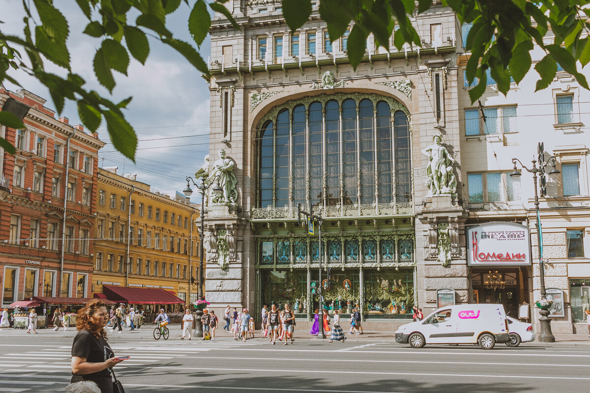 Новый дом на углу Невского и Малой Садовой построили в только появившемся на берегах Невы стиле модерн. На тот момент югендстиль уже прочно обосновался в Вене и Риге, но для петербуржцев был в новинку. Немало копий журналистов ХХ века было сломано в критике огромной арки-витрины, гигантских статуй на фасаде и циклопических башенок Елисеевского.