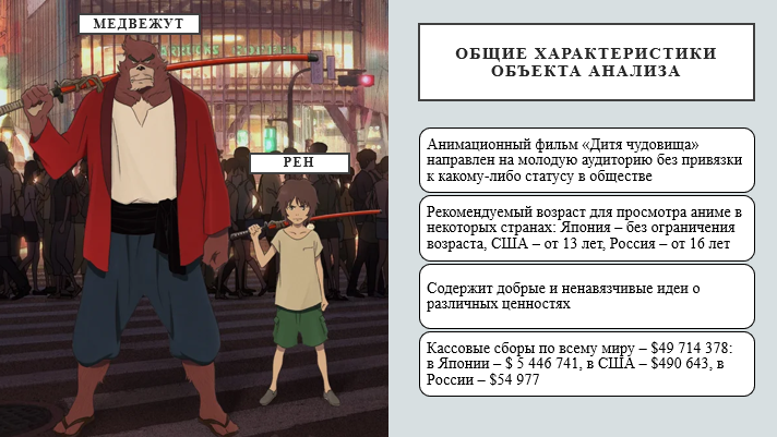Информация о фильме «Дитя чудовища» – это довольно интересный и необычный анимационный фильм, изначально он был направлен на молодую аудиторию. Ненавязчиво предлагаемые автором добрые идеи о различных ценностях, заключенные в сюжете, всё более и более вовлекают зрителя с каждой минутой в данную историю. В результате чего фильм стал популярен, а общие кассовые сборы составили практически 50 миллионов долларов, что делает его достаточно сенсационным для мира мультфильмов. И чтоб обнаружить скрытые и важные элементы фильма, предлагается его проанализировать. Сюжет и преподносимые автором идеи История начинается с того, что мальчик по имени Рен теряет свою мать. После ее смерти он желает остаться с отцом, который не реагировал на это желание, родственники матери не допускали возможности отдать Рена его папе, их свойство не слушать ребенка, заставляя делать лишь то, что им угодно, что кстати легитимируется человеческим обществом в контексте фильма, становится причиной того, что главный гер