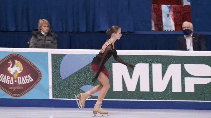 Приветствую читателей блога в новой записи, посвящённой разнообразным граням мастерства Александры Трусовой в фигурном катании. Сегодня рассмотрим редкие элементы и комбинации элементов в исполнении Саши. Блок из элемента валлей и сложного шага чоктау как заход на каскад из тройного лутца и тройного риттбергера. Образцовое качество исполнения всех элементов: хорошая скорость, шаги из чётких крутых дуг хорошего покрытия, а тройной риттбергер – с правильной дуги, без касания свободной ногой льда при отталкивании в него, после приземления из тройного лутца. Тройной тулуп следует из очень высокого шпагата. Поперечный шпагат (russian split, русский шпагат) исполняется отталкиванием, как во флип. Классное исполнение сложного шага выкрюк. Такое исполнение шага заслуживает отдельного рассмотрения. Большое покрытие площадки, правильная красивая траектория, глубина и высокая скорость рёберного скольжения. Ещё одна сложная и редкая комбинация элементов в исполнении Саши. Выкрюк – двойной акс