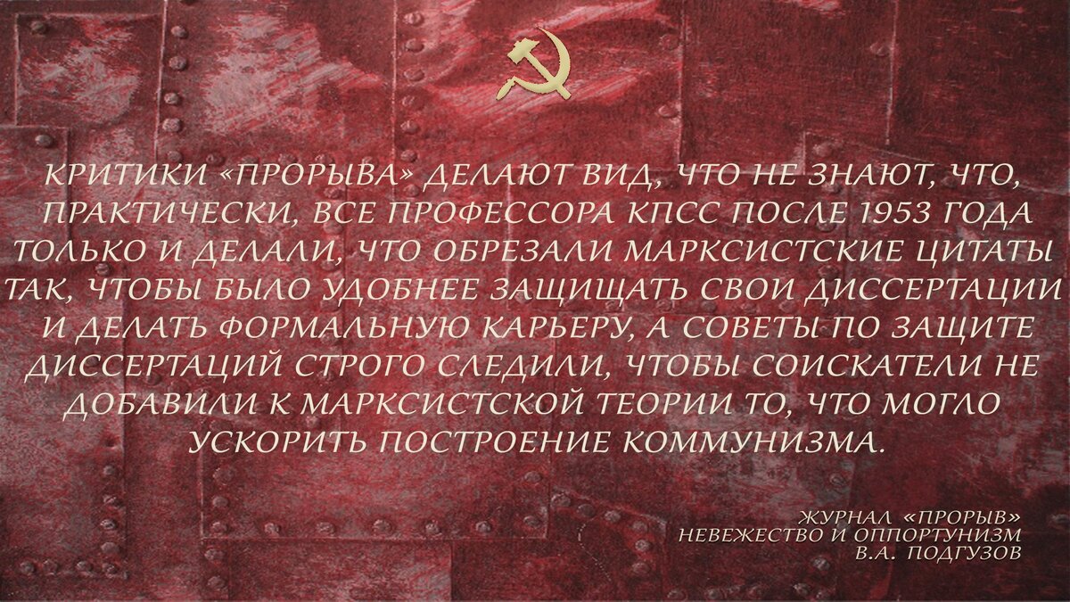 За многие годы совместной работы в редакциях газеты «Рабочая правда», в журналах «Советский Союз», «Прорыв», т.е. почти за 15 лет напряженного ТЕОРЕТИЧЕСКОГО самообразования, научный уровень всех нынешних членов редколлегии достиг необходимой высоты, многократно подтвержденной в ходе ПРАКТИЧЕСКОЙ пропаганды, агитации, литературного творчества, в ходе РЕАЛЬНОЙ борьбы с оппортунизмом в РКРП и вне её. Борьба эта, естественно, велась с переменным успехом, и явилась отличной школой для всего актива «Прорыва», что и определило относительное долголетие коллектива журнала. Т.е. нам не нужна демократия в редколлегии в том виде, в котором она сегодня существует, например, в КПРФ или в РКРП, в которых, благодаря демократическому централизму, большинство давно уже принадлежит оппортунистам.