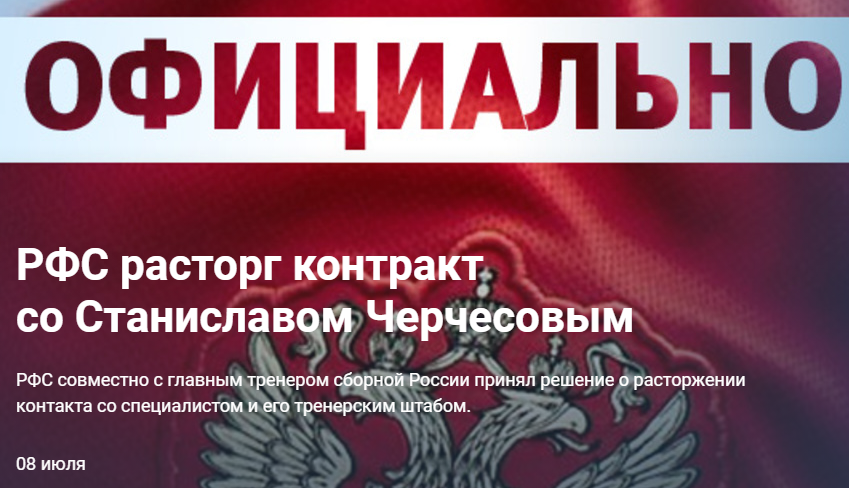 Сегодня РФС (Российский футбольный союз) сообщил, что с главным тренером сборной России Станиславом Черчесовым расторгнут контракт и его тренерским штабом. Комментарий президента РФС: