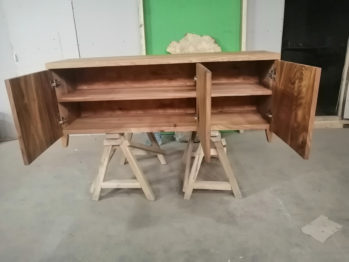 Комод из слэбов - это вам не стол! Это КОМОД! С больших букв. Тут много трудностей, нюансов, хитростей и конструктивных решений. Прежде всего необходимо сделать идеально ровные детали. Если для стола малейшая кривизна не заметна и не критична, то для комода кривизна тут же выльется в зазоры между деталями. Каждая панель, каждая полка должны быть идеально подогнаны как по линейным размерам, так и по углам. Если кто-то из вас работал со слэбами карагача или дуба, ну или другого дерева, то знает их коварство: они норовят искривиться, закрутиться винтом, изогнуться - короче, поменять геометрию в самый неожиданный момент и без видимой причины: просто под воздействием внутренних напряжений. Поэтому древесина должна быть тщательно просушена, отшлифована и покрыта маслом с воском. Навеска дверец не составляет труда, тем более при использовании качественной фурнитуры. В результате получаем такой комод из слэбов карагача: