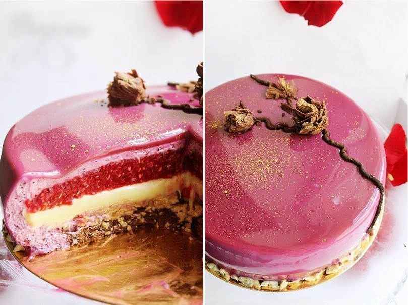 Малиновое конфи: Малиновое пюре в сотейнике поставить на плиту нагреваться. Отдельно смешать сахар и пектин. Довести пюре до кипения, добавить сахар с пектином. Варить, помешивая, до температуры 107 градусов С. Снять с огня. Выложить в форму, меньшую на 2 см, чем диаметр торта. Поставить в морозильник. Внимание! Если вы переварите пектин или, наоборот, недоварите, то конфи может не застыть и «поплывет». Кремё с белым шоколадом: Сливки и сироп довести до кипения. Добавить к белому шоколаду, пробить блендером. Постепенно добавить оливковое масло, перемешать с помощью блендера. Кремё вылить на конфи, поставить в морозильник. Зеркальную глазурь приготовить заранее. Готовую глазурь накрыть пищевой пленкой. Когда она остынет до комнатной температуры, поставить в холодильник настояться на ночь. Шоколадный бисквит: Соединить желтки, яйца и 50 г сахара. Взбить до увеличения объема в три раза. Во второй чаше взбить белки с 20 г сахара. В желтковую массу просеять муку и какао, перемешать до одно