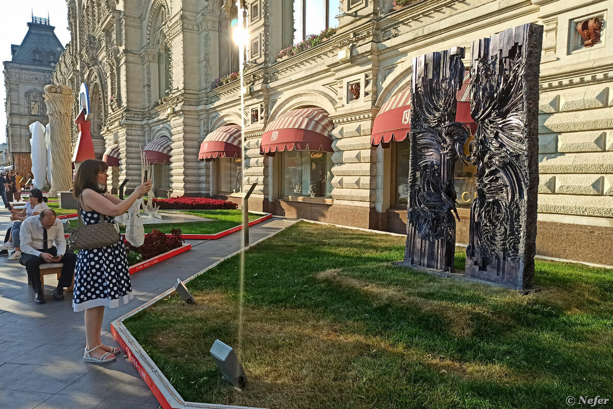 ГУМ-Red-Line в партнерстве с фестивалем Архстояние открыл на Красной площади выставку паблик-арта. Вдоль фасада установлены скульптуры, которые поймут не все. Но все фотографируют. Композиция на заглавной фотографии называется "Французский de Sad", автор Дмитрий Жуков. На табличке написано про боскет - стены из подстриженных кустов. Садовник их подстригает, но они снова разрастаются с удвоенной силой. Ниже гномон или солнечные часы. Фигура вместе со своей тенью представляет двухглавого орла. Автор - Андрей Филиппов. Больше остальных мне понравилась эта фигура. Женщина, поддерживающая небосвод. Называется "После Макоши". Макоши - славянская богиня, которая пряла полотно с нитями человеческих судеб и почиталась как покровительница земледелия, плодородия и женщин. Автор Дмитрий Аске. Колонна. Не читая табличку можно предположить, кто автор. Конечно это Николай Полисский. Лихоборская арка в Отрадном, инопланетные черви на Яузе - это все его. Колонна, пожалуй, первый объект из всего его тво