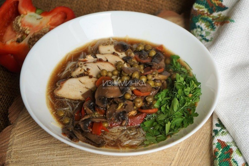 Суп с фунчозой выручает, когда надо накормить семейство, а кормить нечем. Вот тогда на сцену гордо выходит рецепт супа с фунчозой и, победоносно размахивая флагом из свежей летней зелени, громко заявляет, что он прекрасен, вкусен и вообще создан для всеобщего хорошего настроения. Он настолько универсален, что может подаваться как в горячем, так и в холодном варианте. Легко может быть острым и пряным или нейтральным и спокойным. Прекрасен с курицей или свининой, говядиной и индюшкой. Как приготовить суп с фунчозой? Ингредиенты: 1 куриная грудка (предварительно запеченная или сваренная); 1 морковь; 1/2 стакана зеленого горошка; 200 г фунчозы; 3 ст. л. соевого соуса; 1/2 болгарского перца; 100 г шампиньонов; пучок петрушки; 2 л овощного бульона; соль, перец, растительное масло по вкусу. Инструкция Подробный пошаговый рецепт с фотографиями можно посмотреть на сайте в заметке "Суп с фунчозой". Другие интересные рецепты первых блюд можно найти в разделе " Супы и бульоны ". Подписывайтесь на