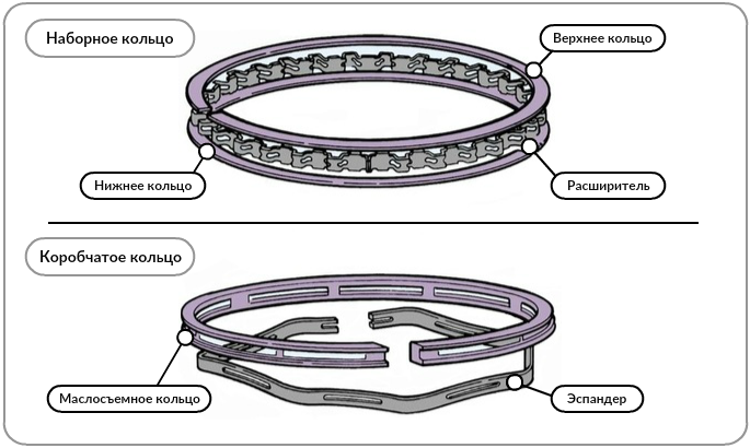 Многие автомобилисты сталкивались с начавшимся "вдруг" и "откуда не возьмись" увеличением расхода масла в двигателе. Причин этого явления несколько, но одним из самых частых является, залегание, закоксовывание, маслосъемных поршневых колец. С относительно недавних пор производители автомобилей в целях увеличения продаж и удешевления производства, начали "изобретать" детали с меньшим ресурсом надежности и меньшими затратами на изготовление. Эти новшества коснулись и конструкции маслосъемных колец. Если раньше они состояли из набора двух тонких колец и пружинного кольца (расширителя) между ними, то современные кольца (не на всех марках авто) имеют, П-образный (коробчатый) профиль, такие видоизменения, обладают рядом недостатков, жесткое, не эластичное по сравнению с наборным, кольцо в работе неплотно прилегает к поверхности цилиндра и масло разбрызгиваемое системой смазки, не снимается полностью, а проникает выше по поршню к компрессионным и в камеру сгорания, где благополучно сгорает,