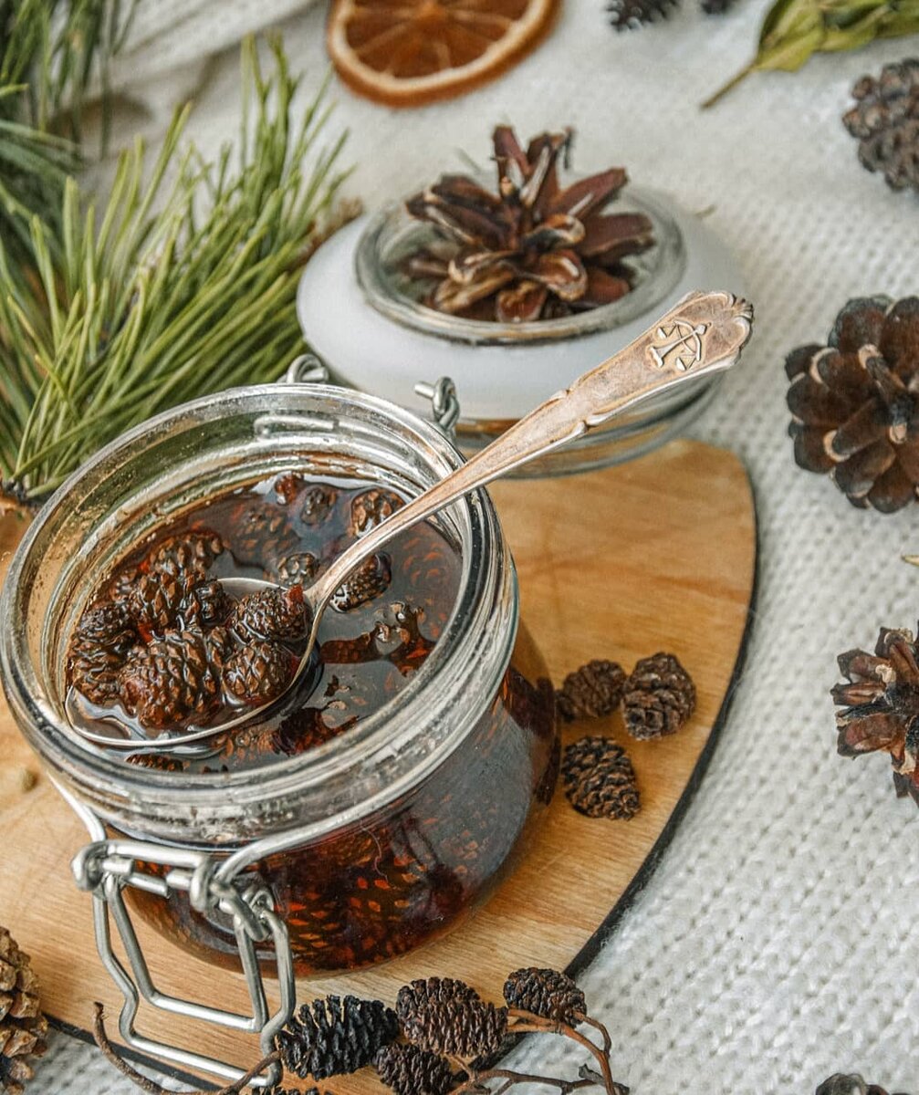 Варенье из молодых шишек, это кавказский деликатес, набирающий популярность по всей стране. Когда я еду на Кавказ, то обязательно привожу с собой пару банок. Продают на сувенирные рынках, но лучше всего покупать на обычных местных базарах (дешевле и качество лучше). Цена от 150р, в зависимости от размера банки. Шишки собирают весной, у удалённых от дорог местах. В наших широтах тоже можно собирать, рецептов варенья в интернете много (сама не варила). Если верить статьям в интернете, то варенье из шишек, мега полезный продукт, в нем содержатся витамины С, К, Р, эфирные масла, каротин. Полезено, при заболевании органов дыхания, укрепления иммунитета, выведения лишней жидкости из организма и тд. В большом количестве варенье может вызвать аллергию, расстройство пищеварения, его нельзя при беременности. Как говорится, всё хорошо в меру и с умом. Вкус на любителя, как будто еш иголки сосны, только они не горькие, а сладкие. Экзотика в общем).